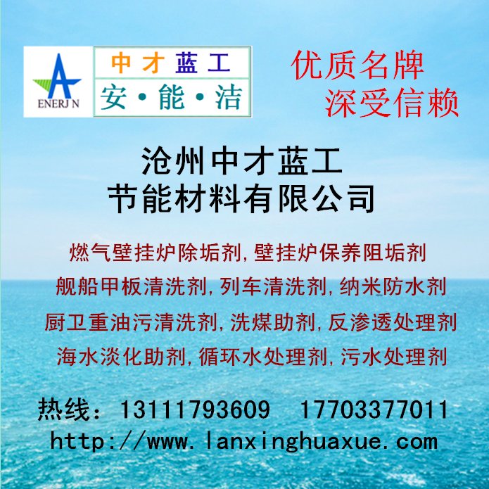 滄州中才藍工節(jié)能材料有限公司13111793609  17703377011 中才藍工安能潔AX-系列和AXNJ-系列: 凈水絮凝劑,高效除磷劑,cod去除劑,新型碳源,設備清洗劑,水泥煅燒增效脫硫催化劑,火電廠鍋爐脫硫脫硝劑,煙氣脫硫脫硝劑,節(jié)煤除渣除焦劑,除污除垢劑,環(huán)保融雪劑,供暖臭味變色劑,壁掛爐系統(tǒng)清洗阻垢劑,鍋爐除氧劑,啤酒瓶洗滌劑,燃氣爐專用阻垢劑,緩蝕阻垢劑,殺菌滅藻劑,硅基防水劑等。